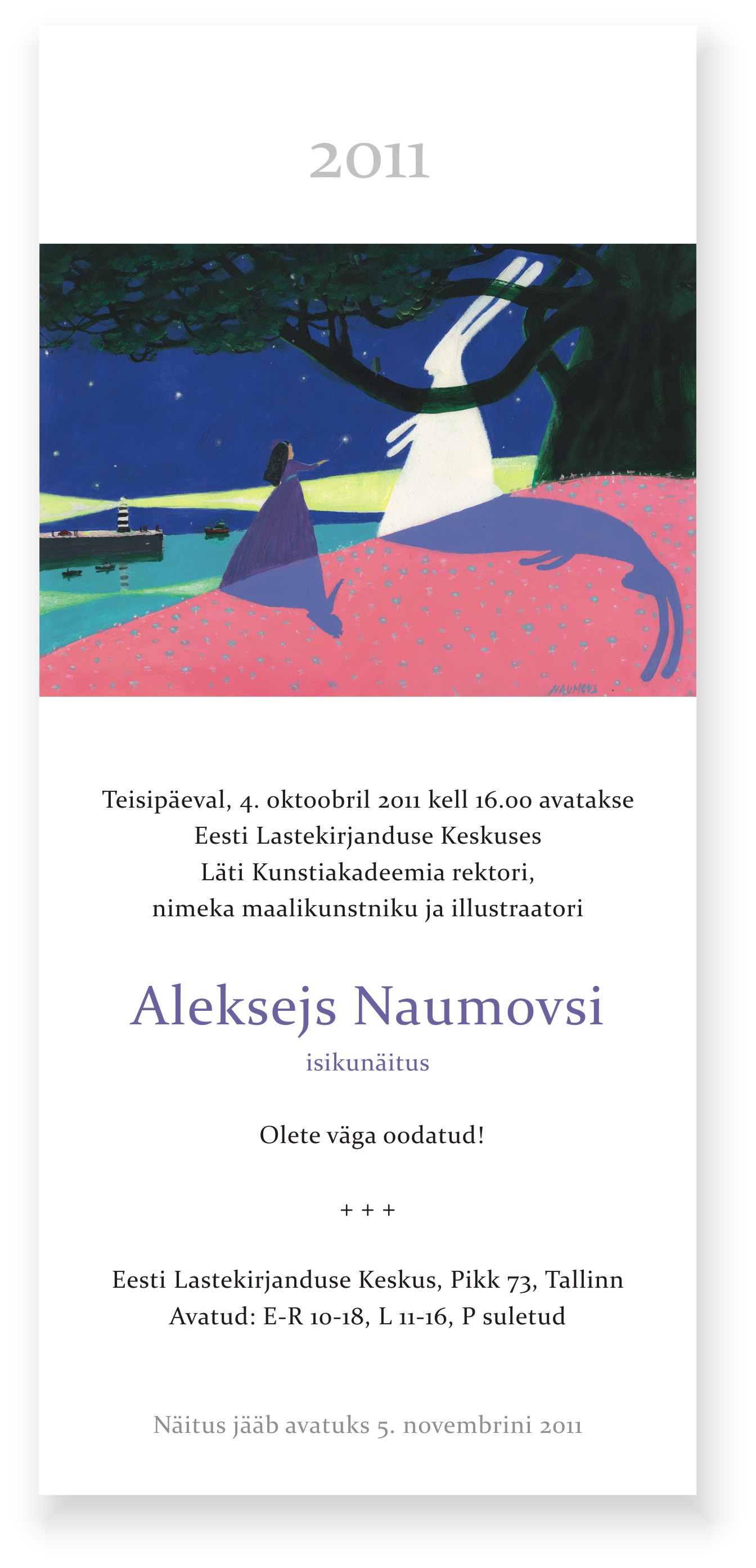 Teisipäeval, 4. oktoobril 2011 kell 16 avatakse Eesti Lastekirjanduse Keskuses Läti kunstnike Anita Paegle ja Aleksejs Naumovsi isikunäitused.