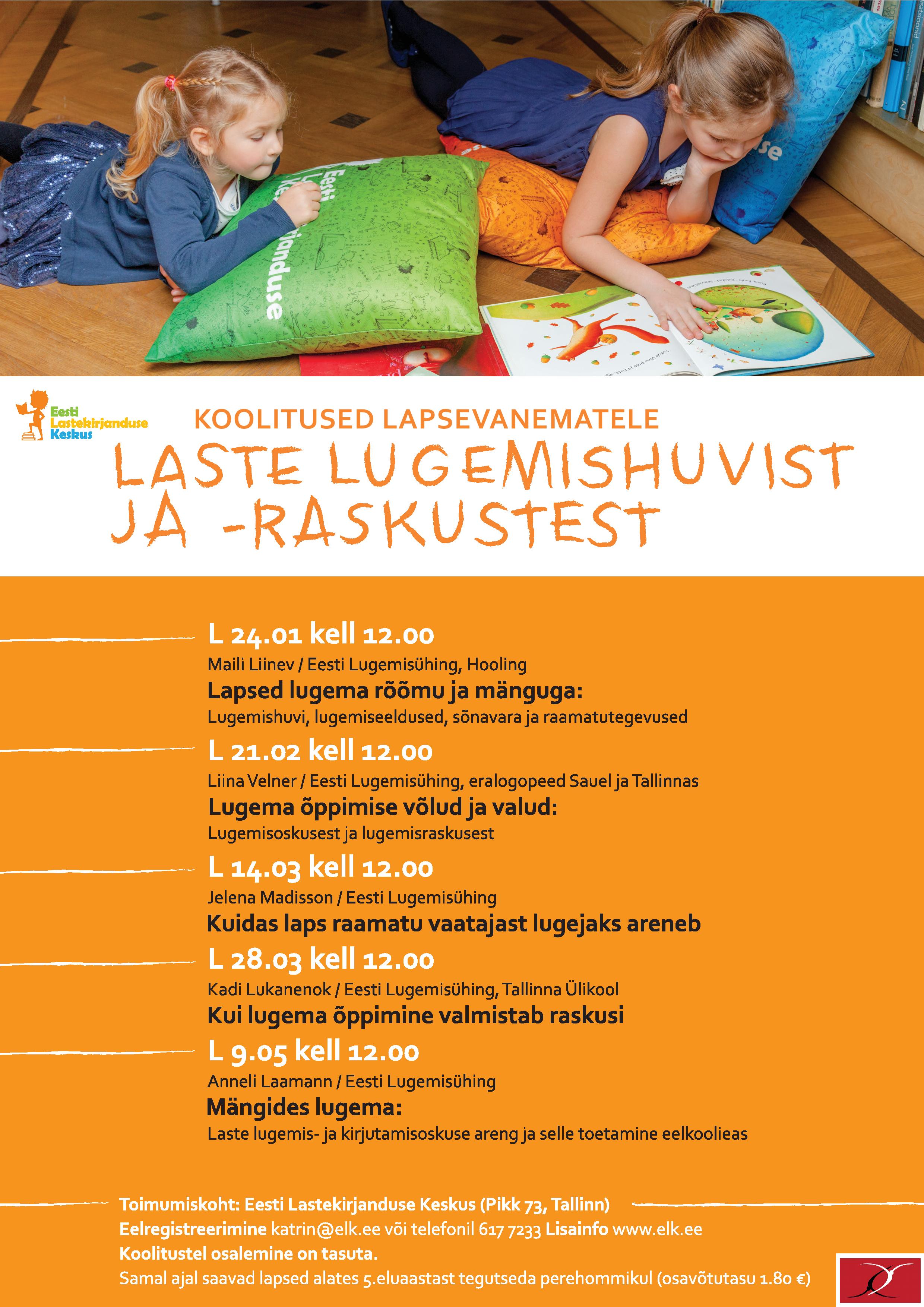 Eesti Lastekirjanduse Keskuses algavad koolitused, kus keskendutakse lapse lugema õpetamisele ja sellega seonduvale. Erinevatel aktiivselt kaasa rääkima kutsuvatel koolitustel antakse praktilisi soovitusi, kuidas äratada ja toetada laste lugemishuvi, kuidas õppida mänguliselt lugema, millised on laste peamised lugemisraskused ja kuidas neid ennetada. Lugedes saab laps teada palju uut ja huvitavat, laieneb sõnavara ja areneb õigekirjaoskus. Toetades lugemist toetab täiskasvanu ka lapse hariduse omandamist.
