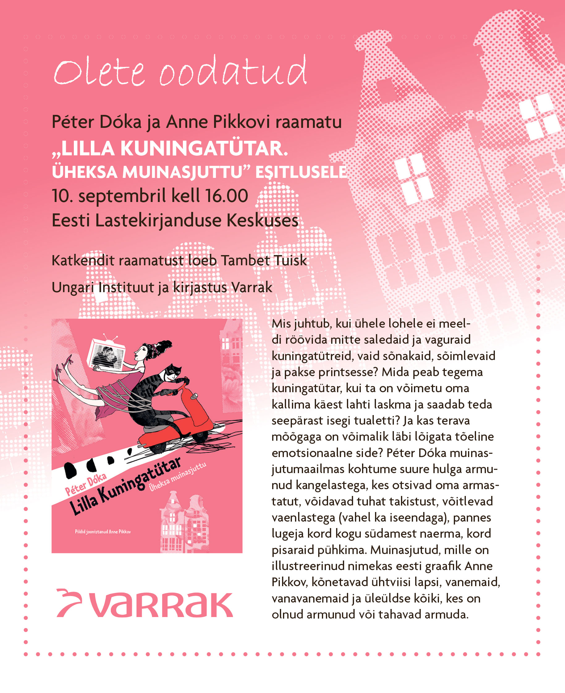 lilla-kuningatytre-kutse10. septembril 2015 kell 16 esitlevad Ungari Instituut ja kirjastus Varrak Eesti Lastekirjanduse Keskuses ungari lastekirjaniku Péter Dóka kogumikku „Lilla Kuningatütar: üheksa muinasjuttu”.