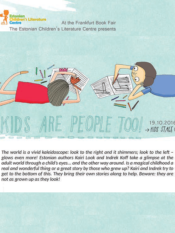 Invitation_Frankfurt_Look_Koff-cut2Täna, 19. oktoobril 2016 algab rahvusvaheline Frankfurdi raamatumess, kus esimest korda astuvad üles ka eesti lastekirjanikud. Kairi Look ja Indrek Koff esinevad messi esimesel päeval kell 16 lastelaval ettekandega „Kids Are People Too!“.