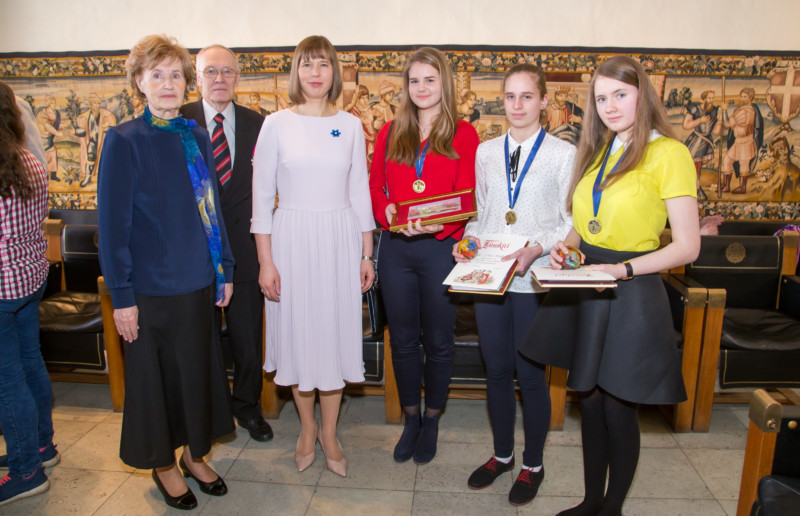 Fotol paremalt: 2017. aasta võistluse võitjad Liisa Raavel, Mia-Mai Kalda ja Rhea Rosette Tüür, president Kersti Kaljulaid ning muinasjutuvõistluse algatajad Ants ja Ann Roos. Foto: Peeter Langovits.