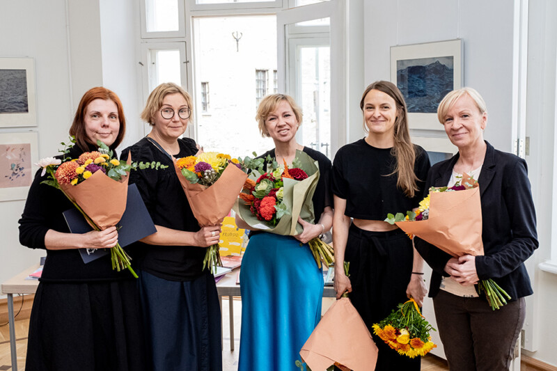 In the photo, this year’s Edgar Valter Illustration Prize laureate Piret Raud is pictured with nominees Ulla Saar, Kertu Sillaste, Marja-Liisa Plats, and Catherine Zarip (author: Aron Urb).
